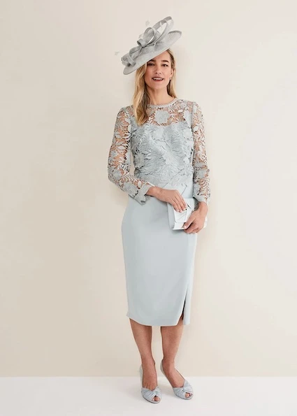 Our Adeline Dress is designed in a sleeveless silhouette with a ruched skirt and modern side split. A detachable long sleeved lace bodice finishes the look. Wear with our complementing Cheryl Frill Coat for a complete Mother of the Bride or Groom outfit.