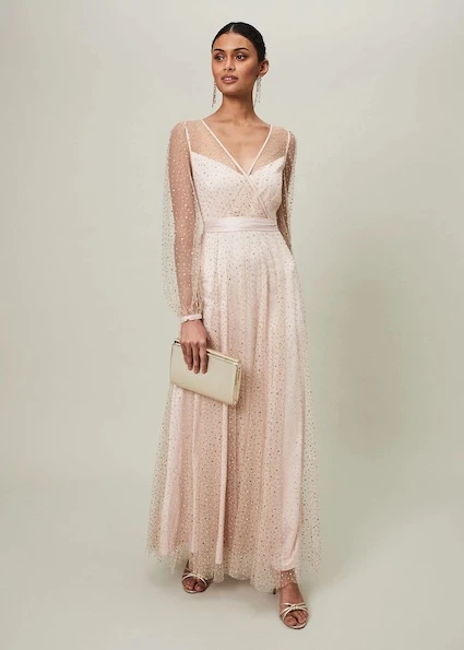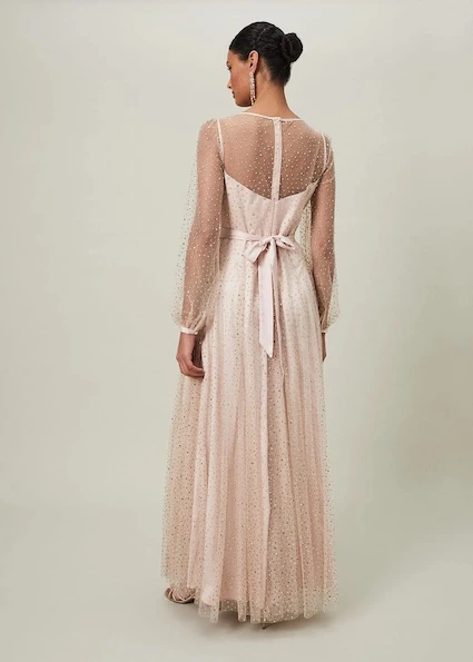 Part of Collection 8, our range of premium evening styles. The perfect dress for your next special occasion. Our romantic, feminine dress features semi-sheer detailing across the V-neckline and sleeves and a glamorous tie back. Pair with nude heels and long drop earrings for an elegant look.