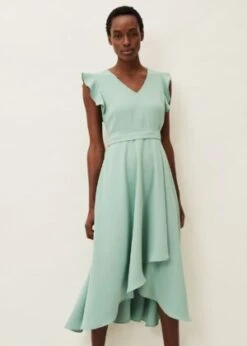 Featuring statement frilled sleeves and a flattering waist tie, this effortless dress is perfect for occasion season. Completed with a playful eclipse hem to add movement and flair.