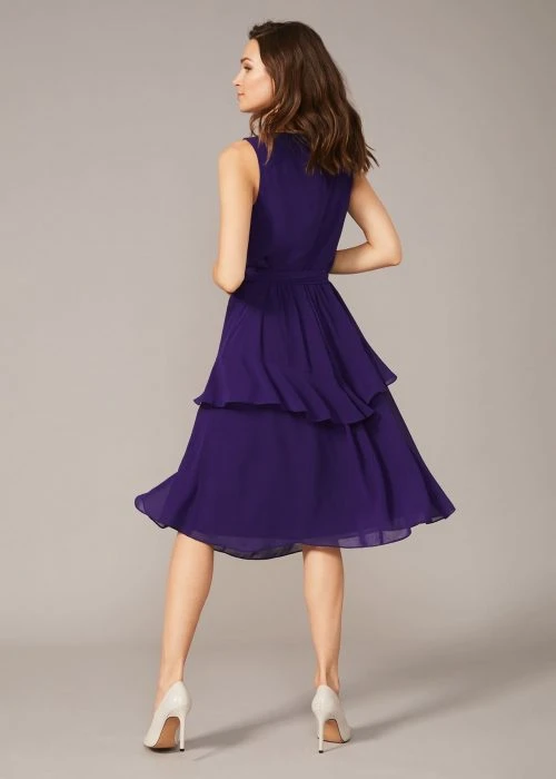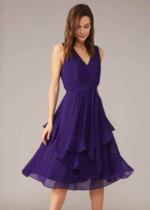 A contemporary silhouette that’s perfect for parties, the gorgeous purple Breesha Dress from Phase Eight is designed in a sleeveless silhouette with an asymmetric tiered skirt that creates wonderful movement as you walk. This style has a matching waist band that you can adjust and tie as you wish.