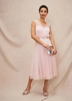 A feminine, romantic dress your wardrobe needs. Designed in a deep navy shade, our Ella dress features a tulle semi sheer V-neckline, an embellished belt and falls to a tulle skirt. Style with matching accessories for a beautiful bridesmaid option or next special event.