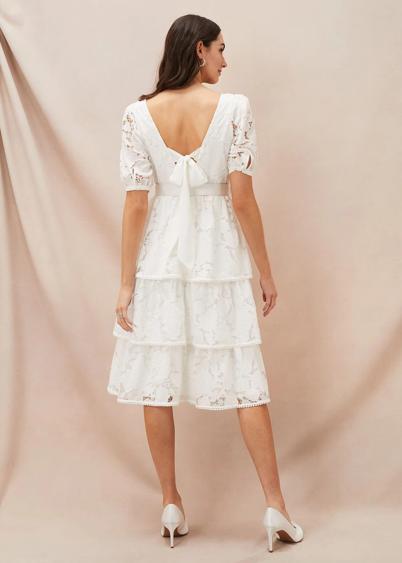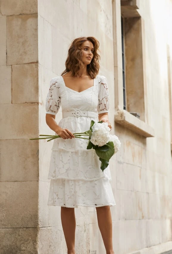 Designed for the modern bride, our Elyse Wedding Dress is the perfect style to say I do in. Cut to a shorter length, this floral lace dress features a tiered skirt with feminine border trims. The sweetheart bodice is framed by semi-sheer puff sleeves and finished with a fabric tie at the back. An adjustable belt to highlight your silhouette completes this stunning look.
