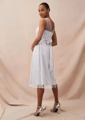 Crafted in a sleeveless silhouette, Evadine is delicately decorated with hand-placed pearl beads, an embellished detachable satin tie belt to accentuate the waist, followed by a voluminous tulle skirt that creates enchanting movement as you walk. The bandeau bodice, framed by a mesh panel, is softly boned, to give a flattering fit.