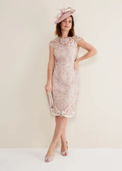 A timeless, elegant dress for special events. Designed with delicate tapework lace design, our fitted Francis dress features semi-sheer detailing along the sleeves and neckline. Style with matching accessories for your next special event.