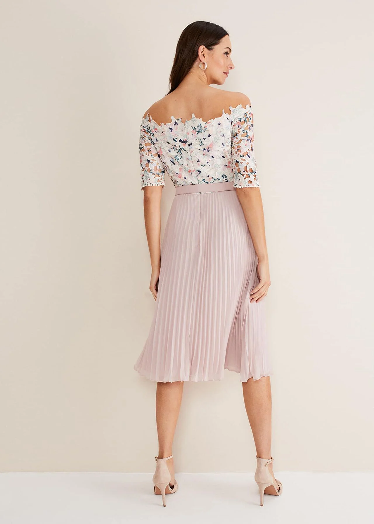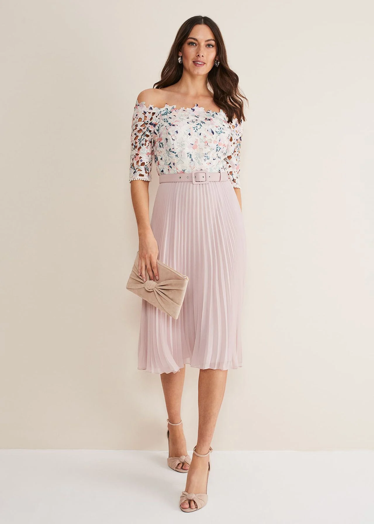 Our much-loved Franky dress with a new twirl-worthy skirt. This romantic dress is designed in a fitted bardot off the shoulder silhouette with a soft floral print and intricate lace detail. Framed by a covered belt that falls to a fully pleated pale pink skirt that creates beautiful movement as you walk. This is a feminine occasion style and perfect Mother of the Bride or Groom option.