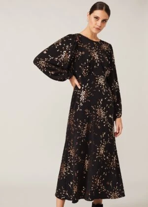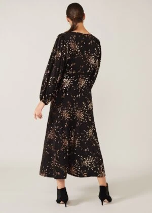 Our Jacinta Dress is perfect for the upcoming festive season. Designed in an eye-catching foil floral print, this midi style is cut in a fit and flare shape and framed with subtle blouson sleeves. If you like this style, see also our Jacinta Floral Top.