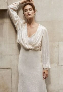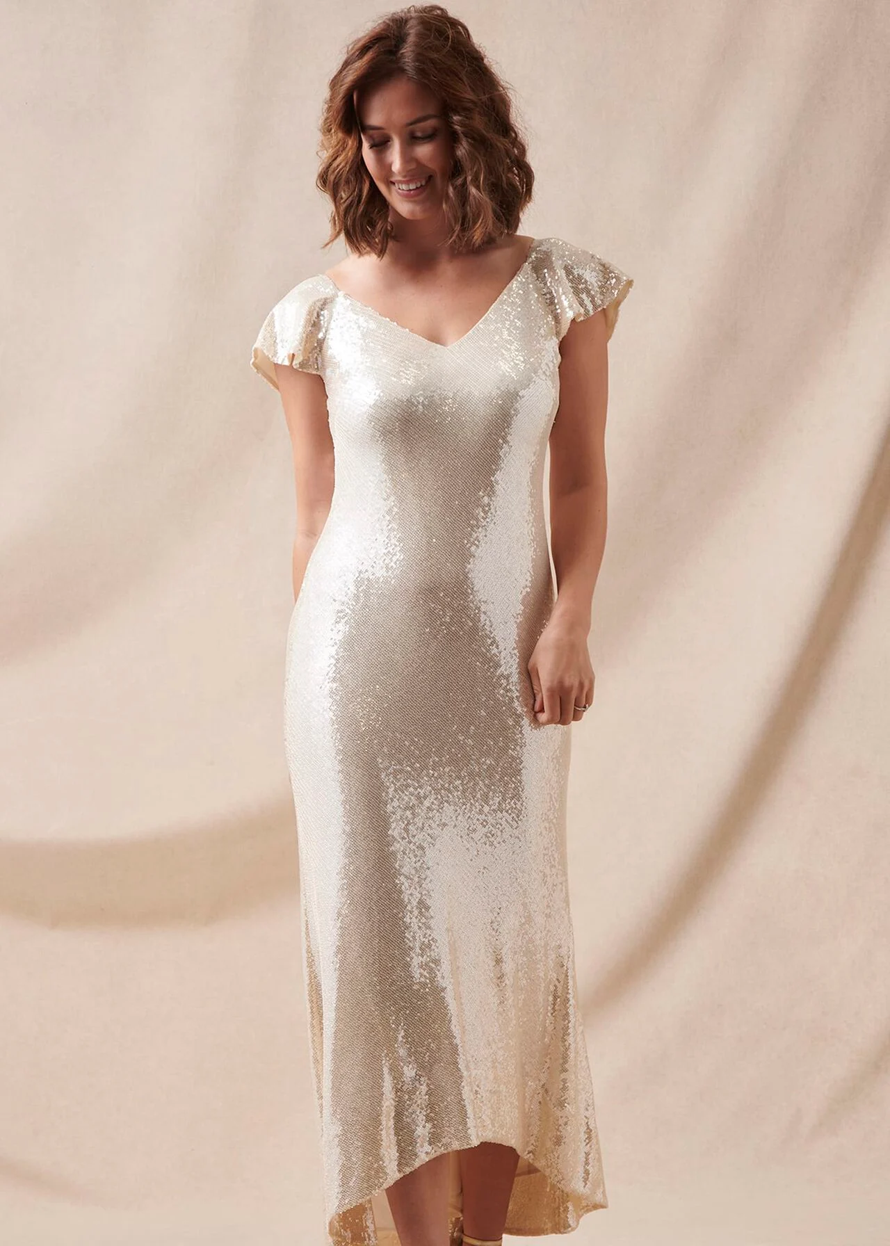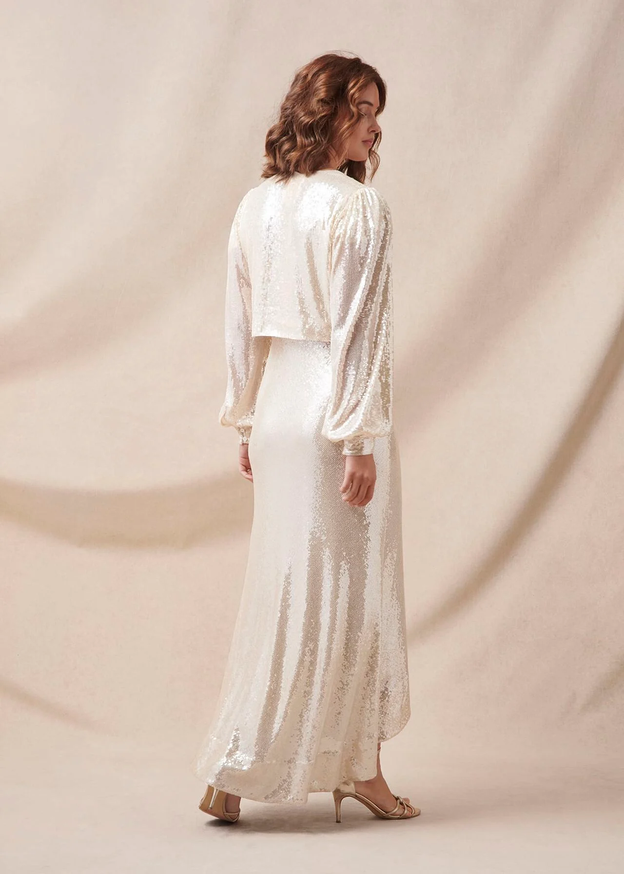 Our statement sequin bridal style is perfect for the big day or for the post-altar party. Designed with all-over shimmering sequins, our Jamila dress features an overlay bodice that completely transforms this style: wear the overlay for a full blouson sleeve, twisted front look, or remove to reveal a feminine V-neckline with softly fluted short sleeves. Style with equally fabulous heels.