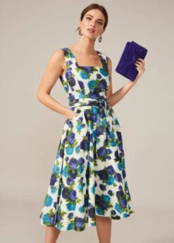 We looked back through our print archives to create this heritage floral print dress. Designed in a 1950s-inspired silhouette, the Janetta Dress features a striking cobalt blue floral print throughout and is framed by a square neckline and matching waist tie. We’ve added handy pockets to this style and empire seaming on the bodice to add shape.