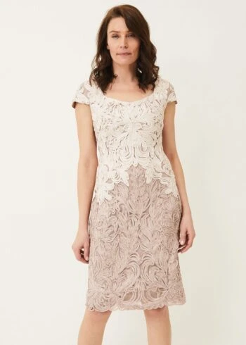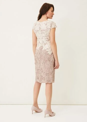 Our signature Phase Eight tapework lace features throughout this fitted occasion style. Finished with cap sleeves and fully lined,the contrasting coloured tapework has been carefully placed to flatter the silhouette.