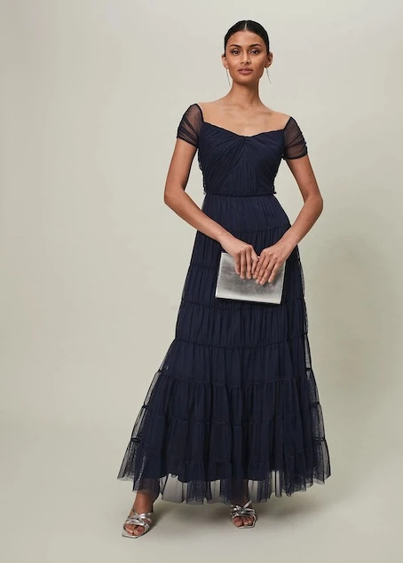 Part of Collection 8, our range of premium evening styles. The perfect dress for your next special occasion. This feminine, contemporary dress features a sweetheart neckline, semi-sheer short sleeves and a fully tiered skirt. Pair with silver heels to turn heads at your next event.