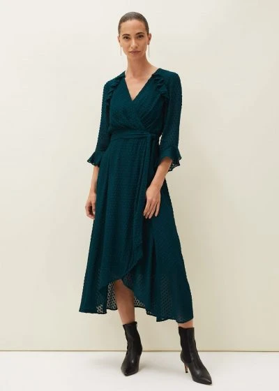 A trend-led occasion style that’ll work for all your upcoming events, this flocked spot dress features 3/4 fluted sleeves and a flattering wrap design.