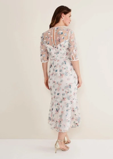 An elegant, feminine style perfect for all your upcoming occasions. Designed with delicate floral embroidery, our Maia dress features semi sheer detailing along the neckline and short sleeves and features keyhole back detailing. Style with gold heels and a matching clutch.