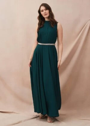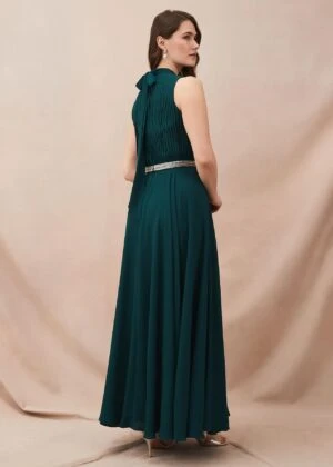 Designed with a delicate pleated chiffon bodice that falls into a floaty maxi skirt, our Nicola dress is an elegant and flattering choice for every silhouette. Finished with a contrasting embellished waistband and verstaile necktie at the reverse, this style would be a beautiful option for a bridesmaid dress, or for other future special occasions such as prom.
