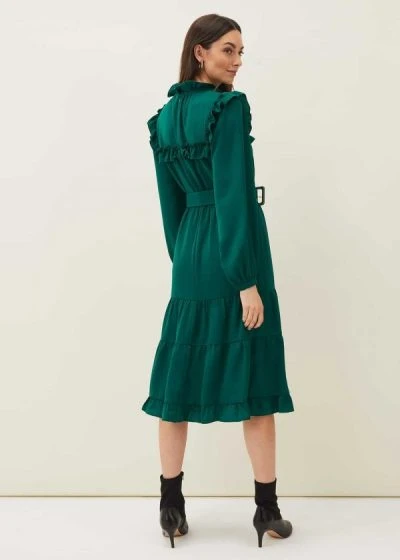 An elegant and modern occasion dress that demands to be worn to your events this season. Designed in a deep emerald green shade, this style is framed by dramatic frill and tiered details, plus a defining buckle belt with contrast gold hardware.
