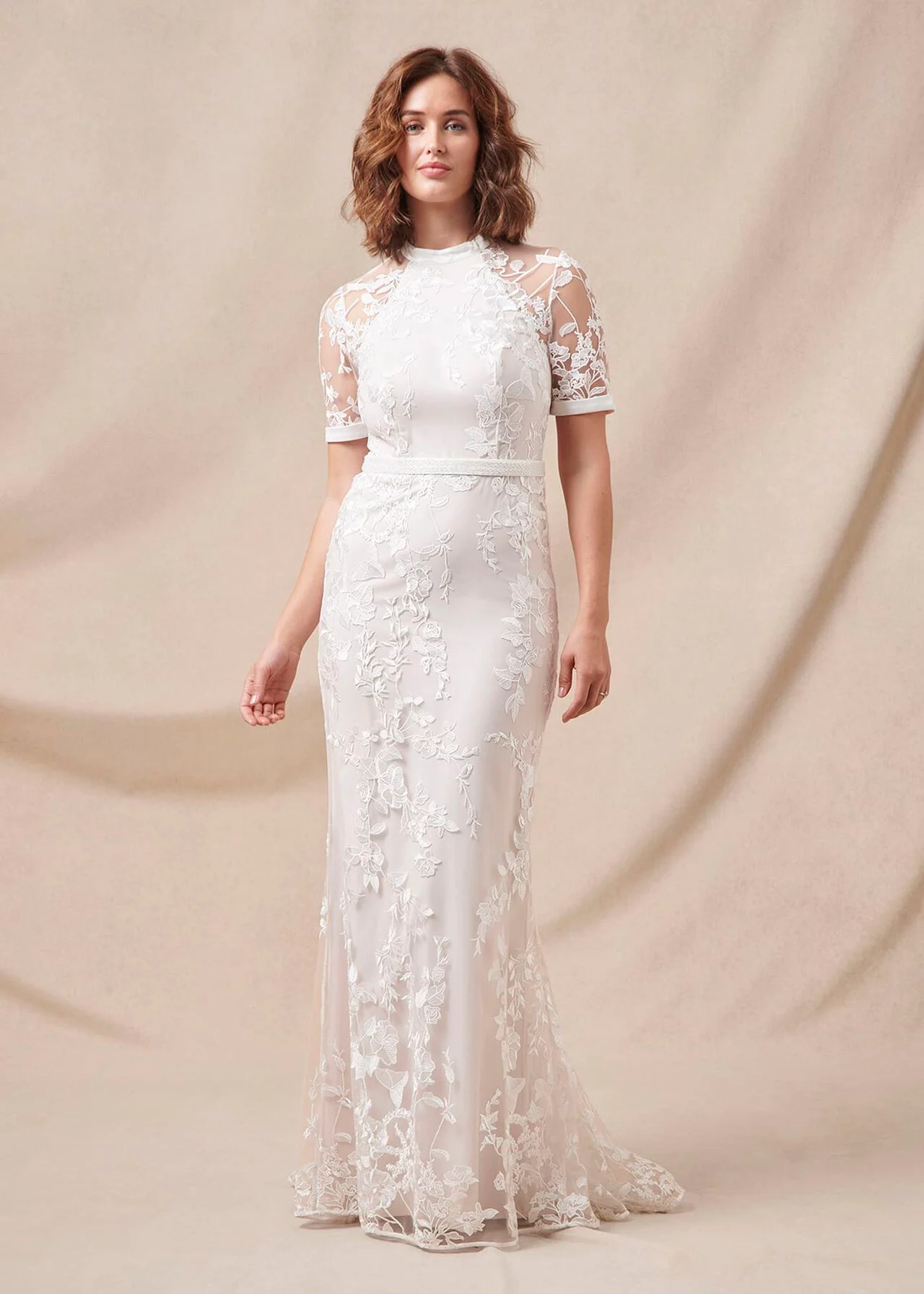 A best-selling bridal style, the ivory Poppy wedding dress from Phase Eight beautifully updates wedding dress traditions for the modern-day bride. Designed with short sheer sleeves, a beaded belt and a line of decorative fabric-covered buttons trailing down the back, this exquisite halter neck dress is embroidered throughout in delicate floral details that is sure to leave your guests in awe. Poppy is the only bridal style that falls gracefully into a small train, perfect if you’re having an outdoor ceremony.