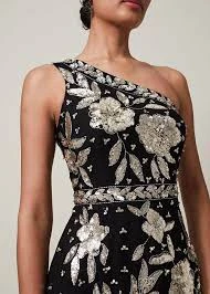 Part of Collection 8, our premium range of evening occasion styles. Our Serafina black dress is designed with all-over floral sequin embellishment that makes this a truly standout style. Sweep your hair up to show off this beautiful asymmetric neckline. We wear ours with gold heels and earrings.
