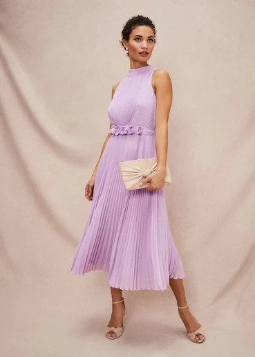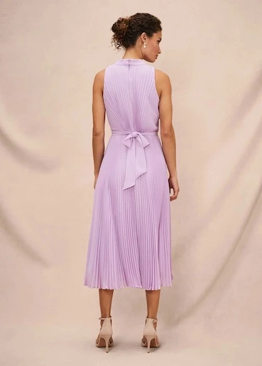 Our much-loved style comes in a brand new colourway. Our Simara dress showcases a beautiful blue shade and is pleated throughout. Our dress is cut to an elegant halterneck silhouette and is cinched with a floral applique belt to highlight your figure. This style would be a beautiful option for a bridesmaid dress.
