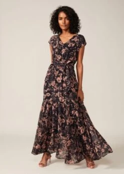 Verena is one of our favourites this season – and will soon be yours too. Designed in a mix of moody blush and navy shades, this floral print maxi is created with a ruched waistline and romantic tiered skirt. We’ve framed this style with short sleeves, a V-neckline and cut-out detail at the back. If you like this print, see also our Verena Blouse.