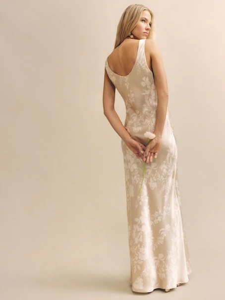 How dreamy. The Annabelle is a slim fitting, ankle length dress with a slight cowl neckline. It gives you a little shape in the areas where you might want it.