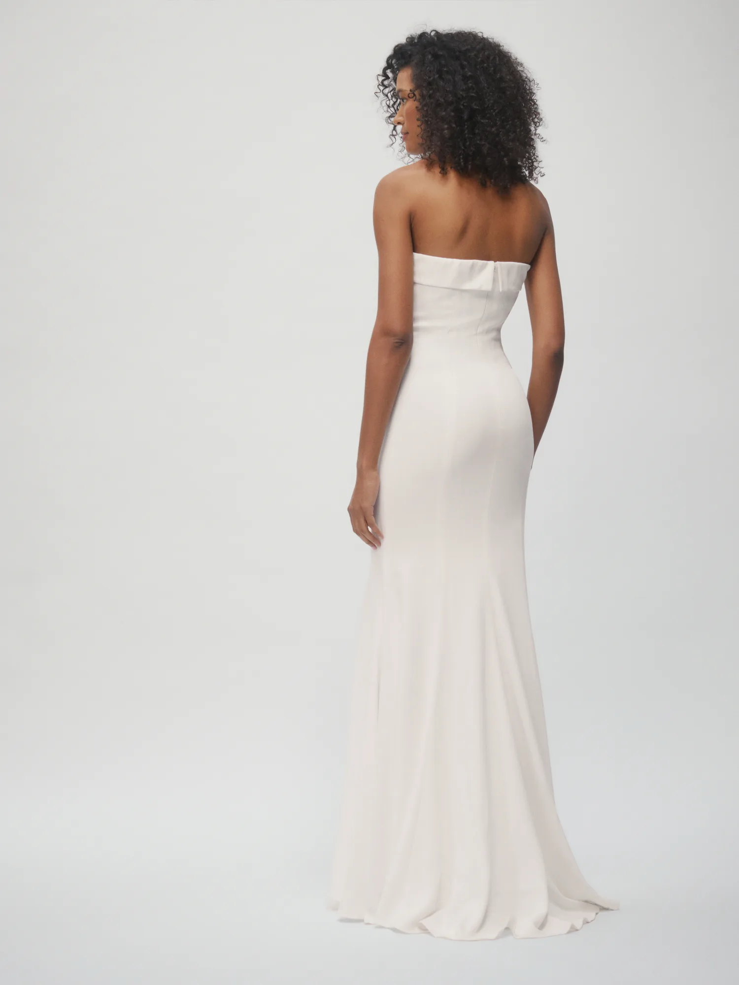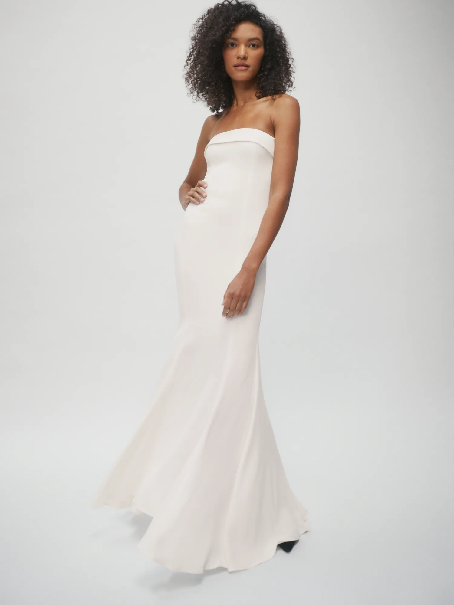 Marriage time. The Lorrane is a strapless, maxi length dress. It features a straight neckline with back zipper entry. It’s fitted throughout giving you a little shape in the areas where you might want it.