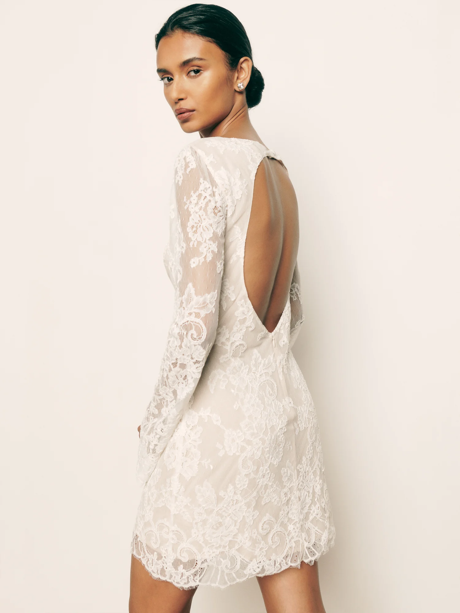 Pretty mini. The Valencia is a fitted, long sleeve, mini dress with a lace overlay. It has a boat neckline, open back, and a scalloped hem. FYI: lace may vary due to limited quantities of deadstock fabric.