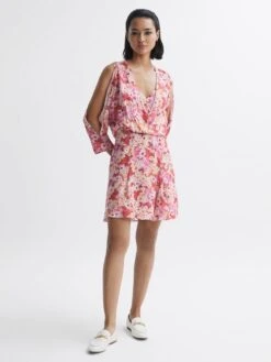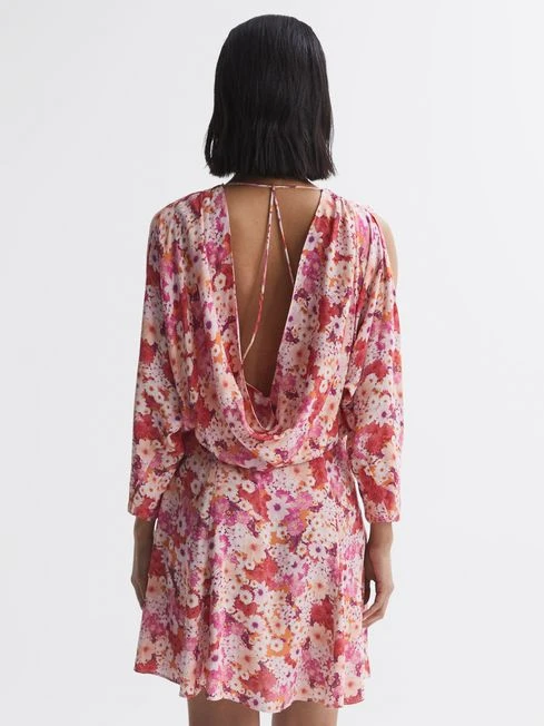 Embrace flirtatious styling with the Annalisa mini dress. iI’s an open-back design complemented with strappy detailing and a floral print. The waist is fitted for a feminine shape, whilst ¾ length split sleeves lend a sensual mood. Its deep v-neckline is assuaged with a slip lining, for a sophisticated appearance. Pair with plain loafers or choose heels for a playful aesthetic.