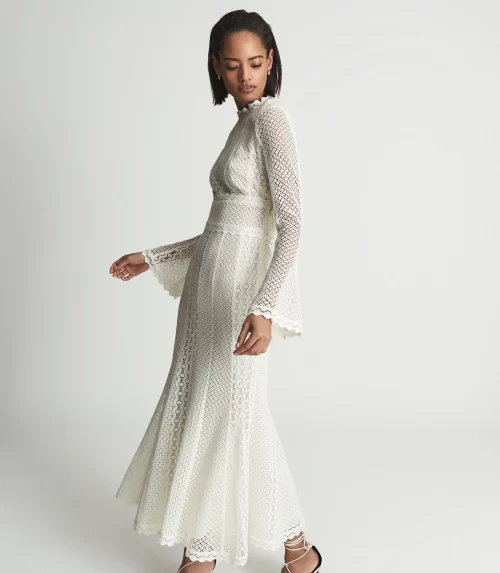 Itβs all in the detail with the Aspen midi-dress in white. Crafted in an intricate lace pattern, this piece is finished with fine detailing like the bell sleeves, flared hem and high neck β all in a scalloped design. The fitted silhouette is amplified by a contrasting waistband and a cut-out back, for the most refined finish. Pair with sneakers for casual cool or dress up with barely-there sandals for lavish events.