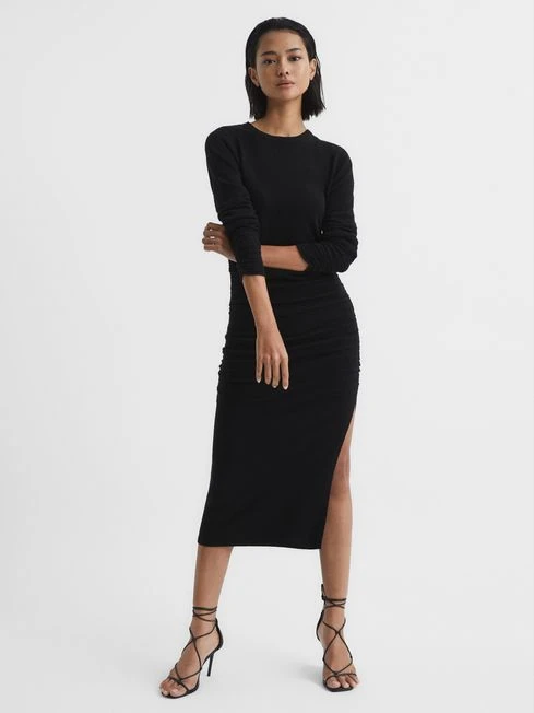 The Charley in black is subtly ruched at the side seams and the sleeves, creating a dress that has a sense of fluidity while fitting closely to the frame. It s crafted from a wool-rich blend with a scoop neck and long sleeves. Wear it underneath a coat during cold snaps.