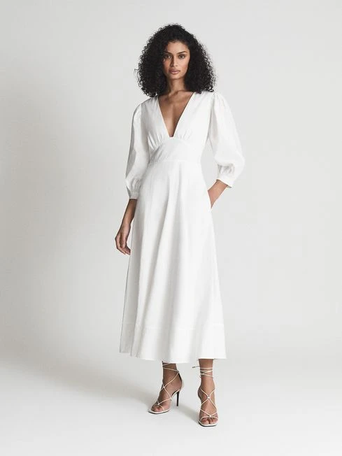 Complete with a plunge neckline and elegant puff sleeves, the Christie dress in white is the ideal wardrobe addition to carry you through your warm-weather occasions this season. Fabricated from a cotton-linen blend with a hint of stretch, you can feel comfortable all day long. This piece is crafted into a fit and flare design to a midi-length, accentuating the sillhouette with fluidity. Wear with sandal heels for a confident day-time edit. Plunge neckline. Self-tie detail to reverse Open back. Puff sleeves Fit and flare. Midi length. Lined Front length measurement (side neck point to hem edge): 133.5cm. The model is wearing a size 8.