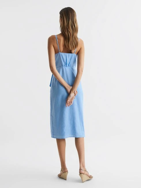 Resort styling calls for the blue Esme dress. Itβs cut from 100% linen for a lightweight feel and it drapes naturally to a midi-length finish. A v-neckline and a side tie element are added to accentuate the profile. Tailor the look with the adjustable, beaded shoulder straps, and slip on your favourite sandals.