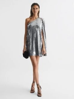 Make a statement with the Eva dress, designed in silver sequins. The asymmetric neckline and cape-style single sleeve present a lavish look. Itβs cut to a mini length that elongates the silhouette.