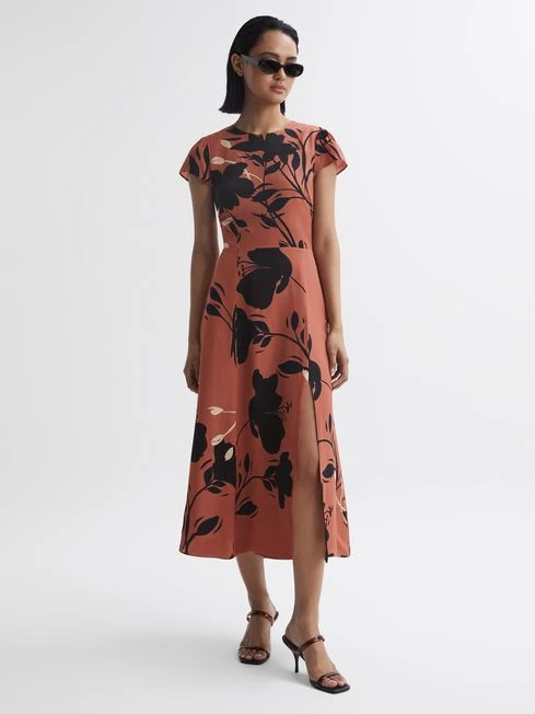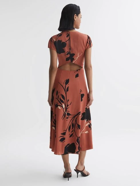 The Floella dress, in a blush and black print, is crafted in a fluid fabrication and cut to an elegant midi length. It features a keyhole and cut-out detail to the reverse, to accentuate the feminine feel. Wear it with heels to your next event.