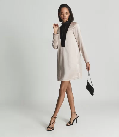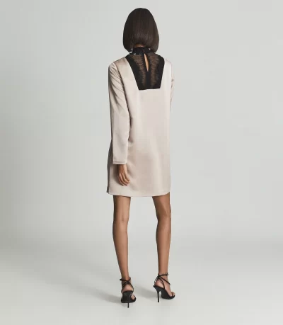 The Gabriel is shaded in muted blush that showcases the silky finish of the satin fabrication. It’s cut to a fluid profile with an intricate bib-inspired lace panel around the neckline. Team it with black accessories for a high-octane mood.