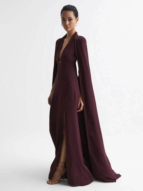 The Grace dress in burgundy is designed for special occasions. Itβs cut with a plunging neckline that forms a halter-neck, then flows to the ankle via a fluid maxi skirt. It features a detachable cape, accentuating the luxe feel, adding a chic winter layer. wear it with heels for a confident evening edit.