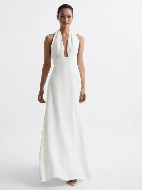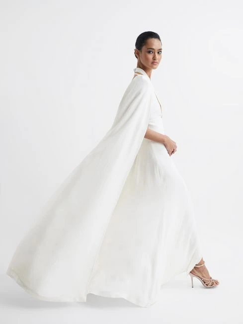 ace dress in white is designed for special occasions. It s cut with a plunging neckline that forms a halter-neck, then flows to the ankle via a fluid maxi skirt. It features a detachable cape, accentuating the luxe feel, adding a chic layer. Wear it with heels for a confident evening edit.