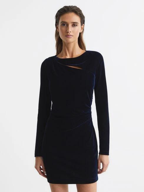 A touch of velvet takes your wardrobe into occasion season. The Katie dress in navy is cut to a flattering bodycon fit with long sleeves and a mini length. The cut-out to the chest adds allure. Simply style it with heels for your favourite party-ready look.