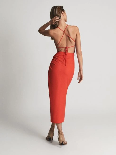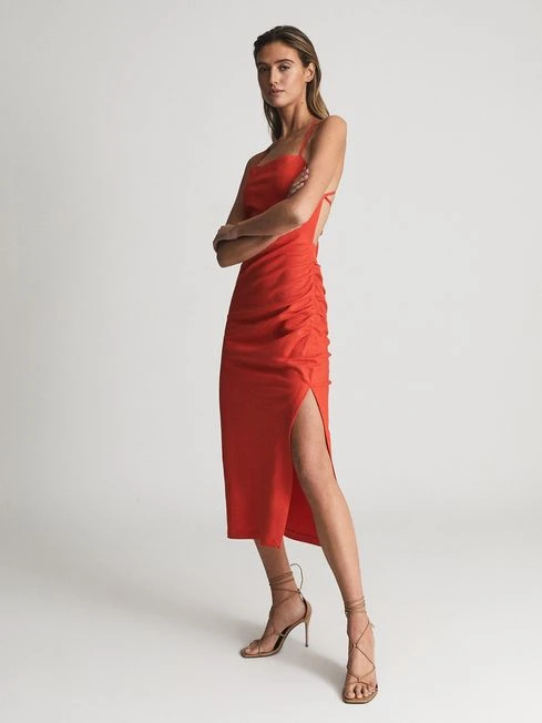 The Khalia midi dress is presented in a bold new colourway in a bodycon silhouette for a flattering finish. Itβs crafted from a stretch-linen fabrication for ultimate comfort and features a single ruched side with a leg slit for added appeal. This style is complete with a square neckline and adjustable thin straps which cross over and tie at the reverse. Wear with barely-there heels to all of your events this season.