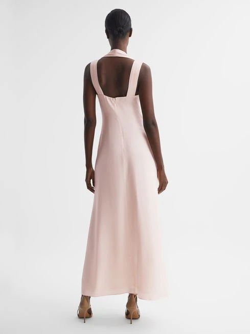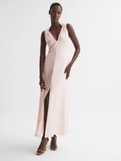 Curate a bridal edit with the nude Lila dress. Itβs cut with a deep v-neckline and fitted with wrapped shoulder straps for subtle interest. Its shape skims the frame, sitting narrow on the waist then falling naturally to a midi length. A front slip finishes the look with subtle allure. Accessorise with a neutral clutch bag and heels.