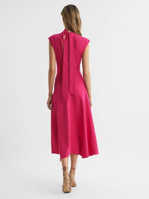 Take centre stage this season in the Livvy midi dress in bright pink. This high-neck style features a striking open-back detail that fastens with a self-tie bow. Style this elegant number with delicate jewellery and heeled sandals for evening events.