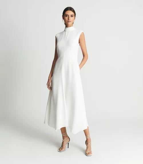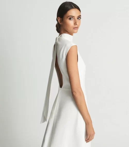 Take centre stage this season in the Livvy midi dress in white. This high-neck style features a striking open-back detail that fastens with a self-tie bow. Style this elegant number with delicate jewellery and heeled sandals for evening events.