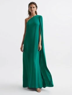 Make a statement with the Nina dress in green. Its asymmetric neckline combined with the cape-style single sleeve presents a lavish look with voluminous tones. Cut to a maxi-length and crafted in a delicately flowing fabrication, this dress is designed to streamline the silhouette.