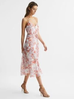 The pale pink Pippa dress is crafted from a lightweight, floral-printed fabrication. Itβs cut with a deep v-neckline and fitted with thin shoulder straps that cross over the back for an elegant look. A belted waist cinches the silhouette, and it flows naturally into a midi length. Pair with high heels for a feminine edit.