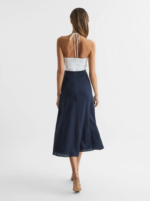The Sian linen dress is designed with a ruched halter neckline and features a cut-out detail to the chest, for an understated allure. It flares out from the waist to a chic midi length, with a front slip reasserting feminine appeal. Style with heels for a must-have occasion edit.