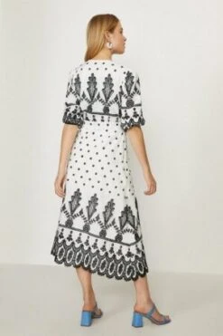 The navy Zena midi dress is the perfect addition to your occasionwear collection. It’s crafted from 100% cotton into a lace design and it’s fitted with balloon sleeves for a romantic feel. A plunge neckline and cut-out details add a sensual mood to this eveningwear centerpiece. Elevate the look with heels. 100% cotton.