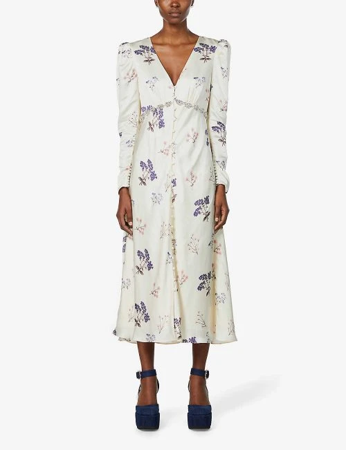 This midi dress is cut from vintage floral viscose. This style is designed with a flattering v neckline finished covered buttons to the hem.