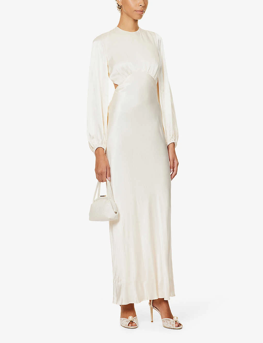 Backless maxi dress with side cut out detail in a silk touch fabric with a luxurious sheen.