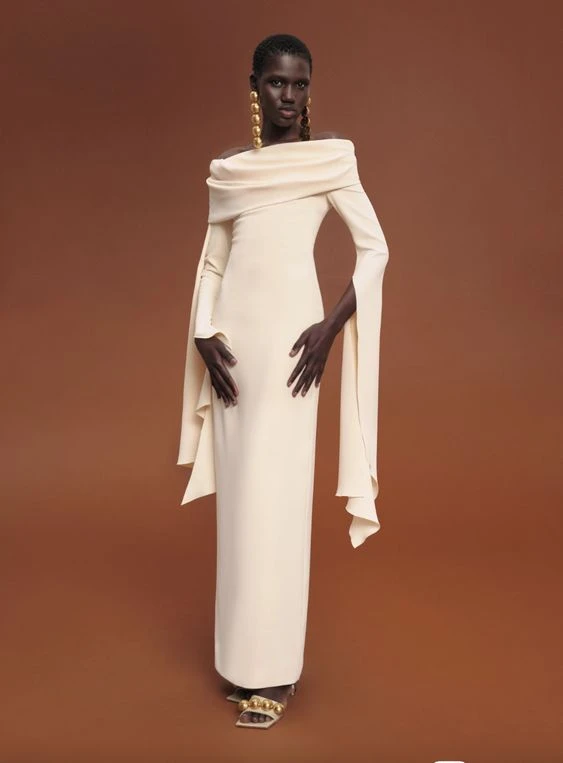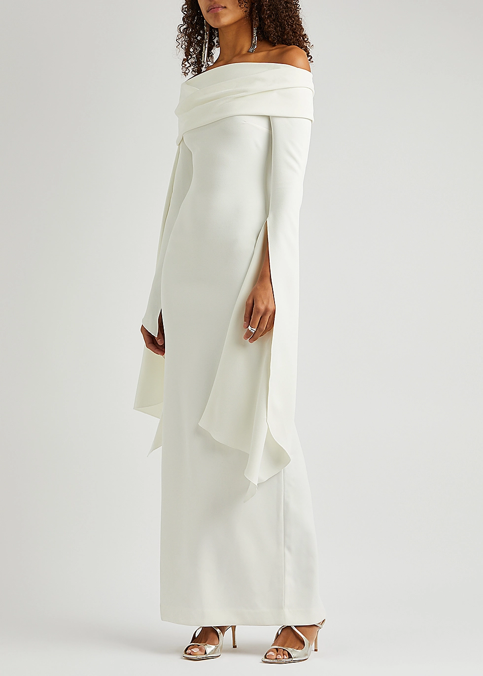 Solace London’s refined take on glamour comes to the fore in the Arden dress. This slim maxi style sits alluringly off the shoulder and is framed with elongated split cuffs that drape dramatically below the knee.