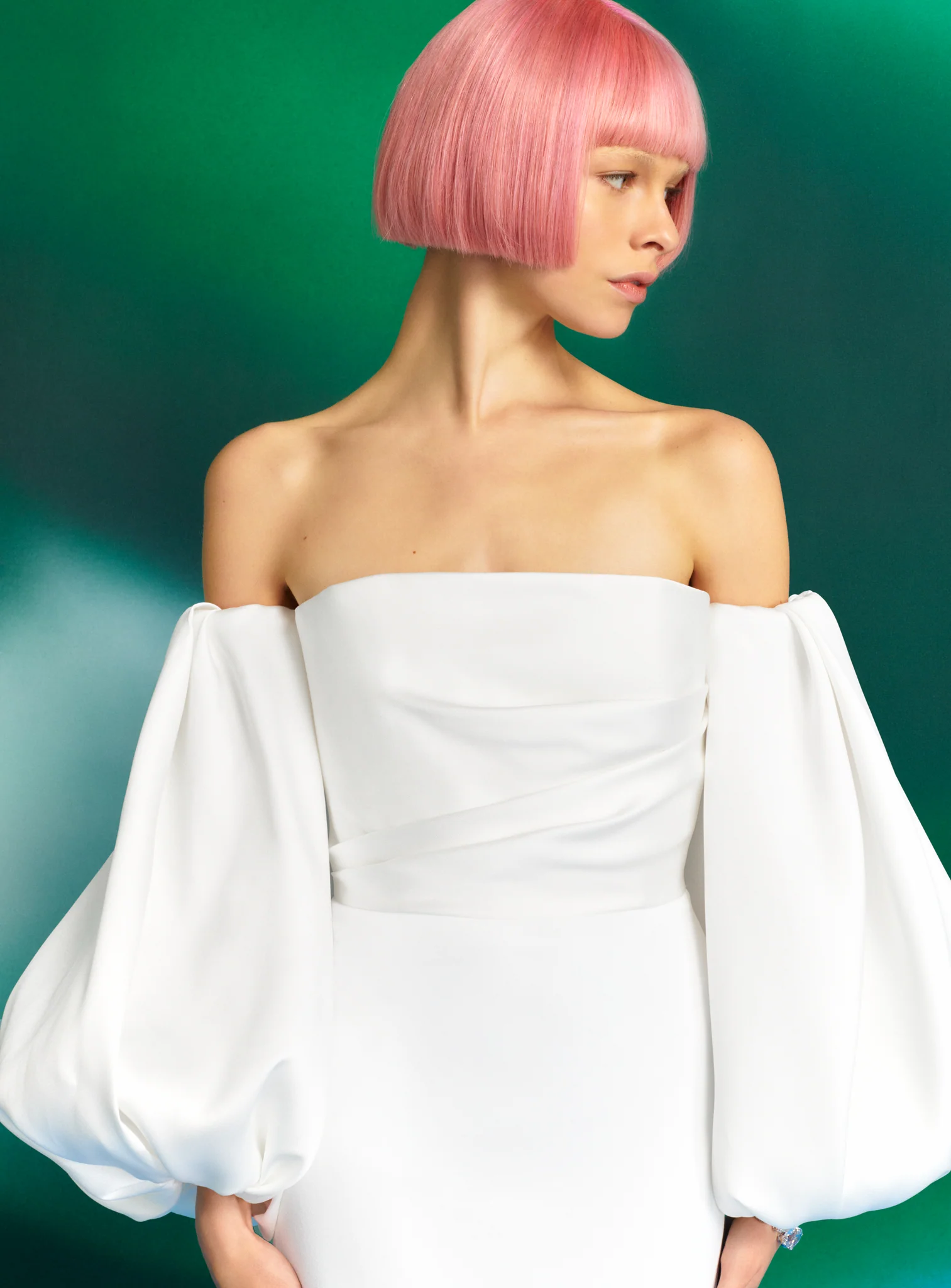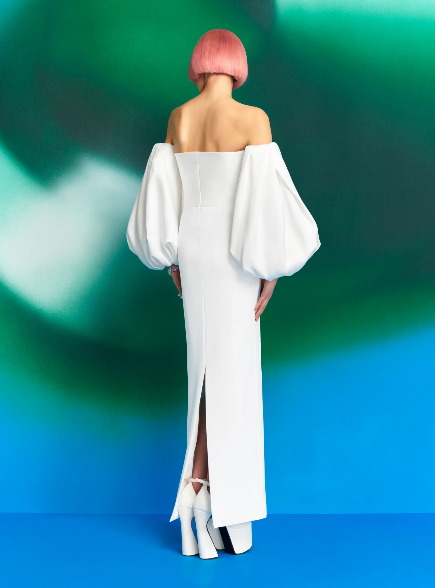 Solace London demonstrates its deft approach to construction in the Carmen dress. Falling to a full-length silhouette, this elegant piece is designed with a fitted satin bodice that’s subtly draped and offset by voluminous structured puff sleeves.