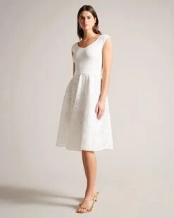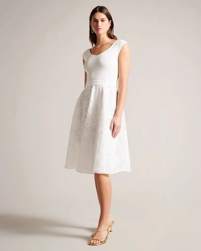 Flaunt your style with the ANNIKAA dress that features a knitted bodice with a scooped V-neckline. Its fit and flare silhouette leads down to a stunning floral embroidered skirt that adds a touch of elegance for special occasions. The knitted bodice and floral embroidered skirt create a sophisticated contrast that’ll wow at any special occasion.