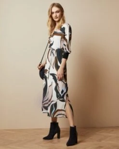 Ted Baker DEYJA Graduated Midi Dress With Ruched Puff Sleeves, Purple/Multi